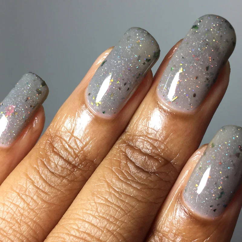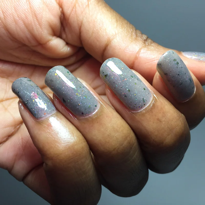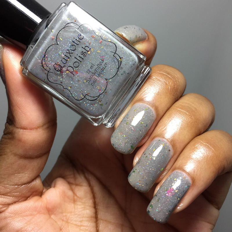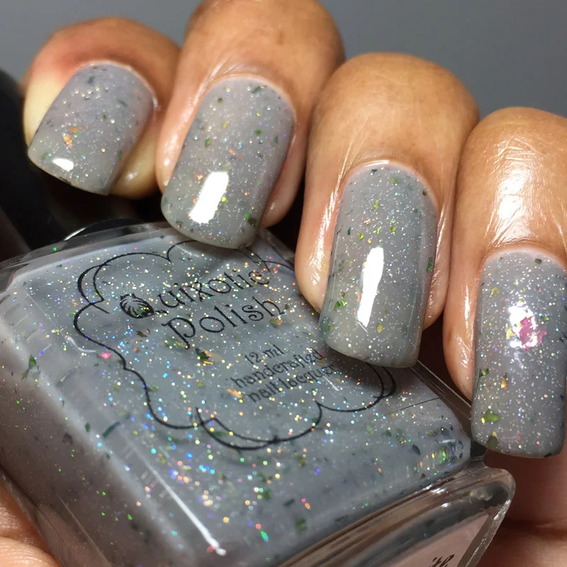 Andalusite is a stone grey jelly with UCC flakies and holographic microglitter. I love the squishiness of Quixotic's jelly formula. Andalusite applies quite sheer. In fact, the first coat was so transparent that I think you could use it as a topper if desired. I wanted the color to be more opaque, so I used three coats plus a top coat. I recommend applying a grey base color first if you want to achieve full opacity. It's a very pretty polish, but I think the color looks more muted on my skin tone. It works well as a nice neutral or office-friendly shade.