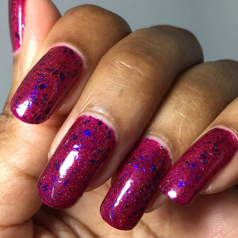 Pyrope is a rich, juicy berry magenta jelly with UCC flakies and holograhic microglitter. GORGEOUS! I'm in love with this polish even before opening the bottle. The magenta color alone has me swooning. Then throw in the vibrant blue flakies?! Lordt! Mary, the creator of Quixotic Polish, has really outdone herself with this one. It's definitely a new favorite and I think it's a must have.